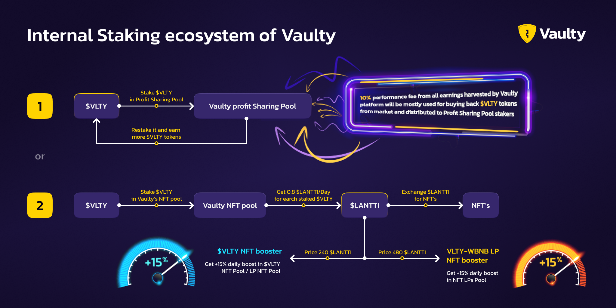 用户可以将手中的 VLTY 代币与 BNB 质押到 PancakeSwap 中变成 VLTY-WBNB LP 代币,然后质押到池子中赚取 LANTTI 代币,后续可以用于购买 NFT