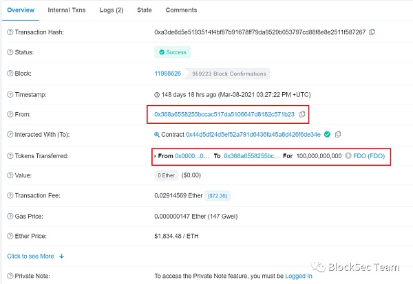 攻击者首先创建了两个 ERC20 代币的合约 (FDO 和 FUSDT),可以简单理解为造了俩假币(没价值)。并向自己的地址(0x368a6)分别转入了大量的这两种 token,为之后的攻击做铺垫。