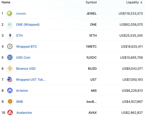 Defi Kingdoms平台总流动性达253,019,512美元,日交易额43,538,419美元,过去三个月总体上也是一直保持超高速上涨,平台流动性排名前三的token为别是Jewels(平台Token)、ONE(Harmony链币)以及ETH。