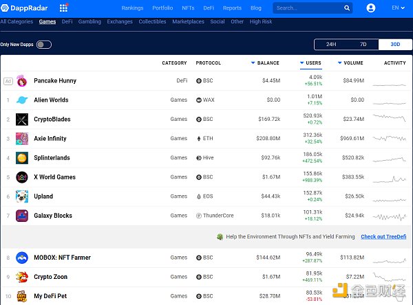 近日,ZB的链游板块继AXS、YGG和SLM之后,又上线了一个热门游戏Alien Worlds的代币TLM。Alien Worlds是和Axie Infinity几乎同时大热的链游,并且上升速度同样非常之快。据DappRadar统计,Alien Worlds在30天内新增用户100万,远超近期大热门Axie的用户增长数,位居区块链游戏排行榜首。