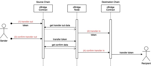 在链下的 cBridge 节点会持续监控各个链上 cBridge 合约的动作,当它发现源链上有一笔新的 transfer out 请求,它会在链上取得这笔 transfer out 的细节,主动对部署在目的地链上的 cBridge 合约发起 transfer in 请求。