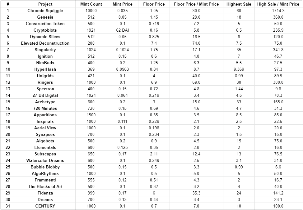 在我看来,下一个突破 100 ETH 地板价大关的项目很可能是 Archetype、Subscapes 和 Unigrids。它们可是 Art Blocks 社区中的大热项目,严重供不应求。我认为这几个项目大家并不陌生。不过尽管我们也都很喜欢那些新的项目(比如 Pigments,Fragments of an In?nite Dream,phase 等),但从长远来看,它们可能并不会比前面那些低供应量的项目更好。虽然如此,谁也没想到有那么高供应量的 Fidenza 会成为地板价最高的 Curated 作品,甚至超过了某些 OG 项目,所以说,就算有新项目取得了惊人成就,我们也不用太过惊讶。