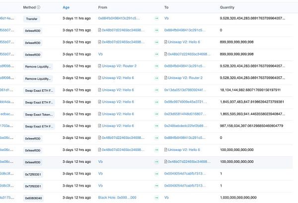 而通过分析该项目合约交易记录发现,Vb 账户的转账操作均是由合约管理员发起,而链上并未有对应的 Vb 账户授权操作,故可以确定该 Hello 代币合约代码中一定是被做了手脚。