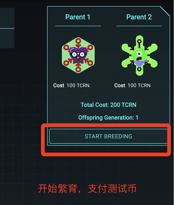 5、选择右侧 START BREEDING,消耗掉测试币,进行繁育。