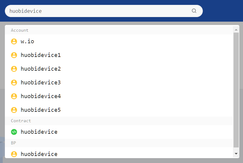 通过EOSpark浏览器的搜索,w.io账户中有向名为huobidevice2的账户进行了大资金转账,而再次查阅huobidevice相关的账户,其中存在从1到5为顺序的多个huobidevice账户。