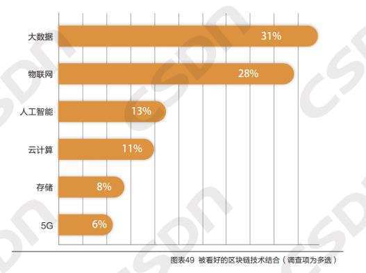 根据《2019-2020CSDN 中国开发者报告》,有 31% 的传统开发者看好大数据与区块链的结合、28% 看好物联网与区块链的结合,13% 看好人工智能与区块链的结合等等。