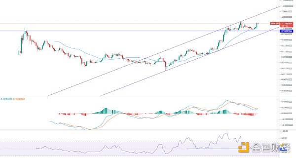 ADA自前期突破大圆弧颈线压制线,后面各种调整都未再破,包括519大跌,说明该趋势线的强支撑性,后面价格在这一带反复震荡后触碰30周线迎来反弹,可以发现去年也是在30周线一带震荡消磨后迎来大波段行情,并且RSI回落至同一支撑迎来反弹,MACD指标线也有再次金叉迹象,所以后面ADA存在二次爆发的可能,按大圆弧结构理论目标还有很大空间,可以等后面9月大调整低吸的机会。