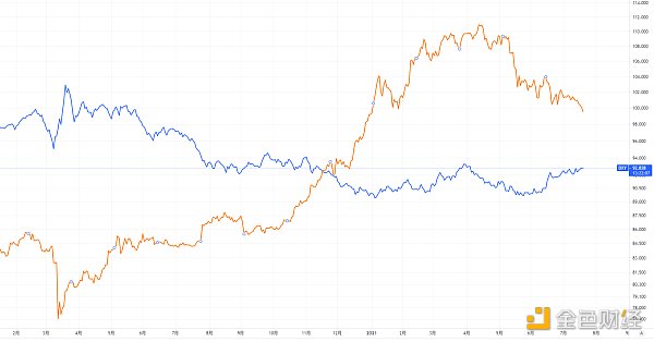 如图所示,黄色线比特币走势,蓝色线美元指数走势,去年312大跌开始,BTC启动牛市,一路涨至64850美金在回落至目前30000美金一带,同期去年3月开始,全球放水,美元指数进入下跌周期,从103下跌至89附近止跌回升,这一段两者走势基本呈现负相关。