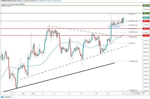 随着短线高位横盘行情的走出,目前BTC 4小时50周期均线抬升的脚步明显加速,截至发文时段,目前4小时50周期均线已经上行至7230(前期标记的三角形结构突破口位置)上方,这也让短期“托底强支撑”的位置明显上移。加之在最近两次明显的回踩试探过程中行情都非常精准地停留在前一轮上涨波段回调0.382黄金分割线对应的7500附近,这也让该支撑的有效性得到了反复验证。因此,目前下方不远处的短期支撑强度相当理想,这为行情进一步走强提供了一个相当理想的环境。