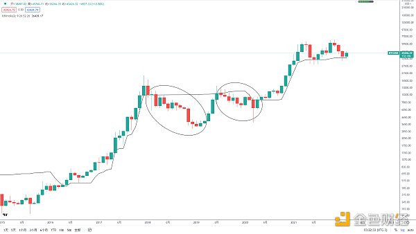 从长期趋势指标线看,上月BTC收线仍未有效跌破,本月以指标线为支撑迎来超跌反弹,而历史上前几轮熊市均是月线跌破,然后向上回抽至该线附近确认后再次回调进入熊市。