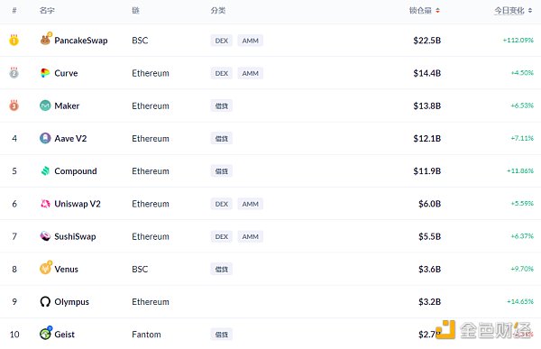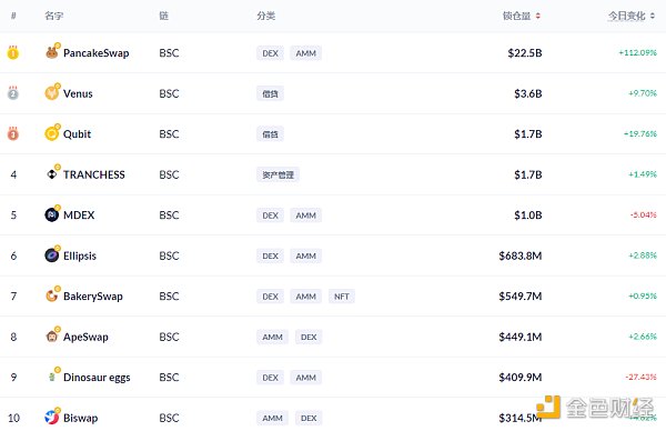 BSC链上DeFi锁定资产前十排名及锁仓量,数据来源:Debank