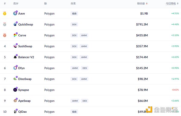 Polygon链上DeFi锁定资产前十排名及锁仓量,数据来源:Debank