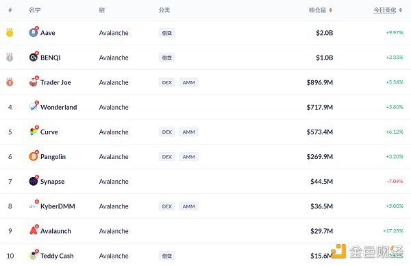 Avalanche链上DeFi锁定资产前十排名及锁仓量,数据来源:Debank