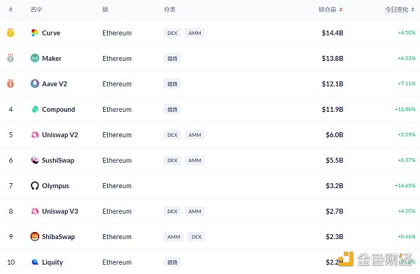 Ethereum链上DeFi锁定资产前十排名及锁仓量,数据来源:Debank