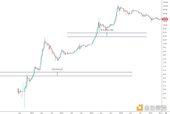 BTC2010-2011年牛市和2012-2013年牛市,研究可以发现,价格在突破前期牛顶之后,不论后续拉升多高,都有一个大力回踩的过程,关键这个回踩下方的支撑区域都位于前期顶部上方50%-60%的位置,价格在此触底反弹,整理后继续牛市新高走势。这两次从突破后上涨高点调整的幅度都不小,一个接近50%,一个高达80%,强势洗盘后继续牛市行情,后面的走势便是牛市的疯狂期,拉升力度比之前更强。