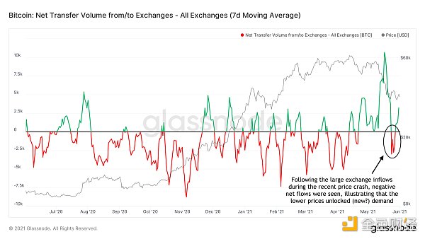 图 16:从/到交易所的比特币净转移量的 7 天移动平均值