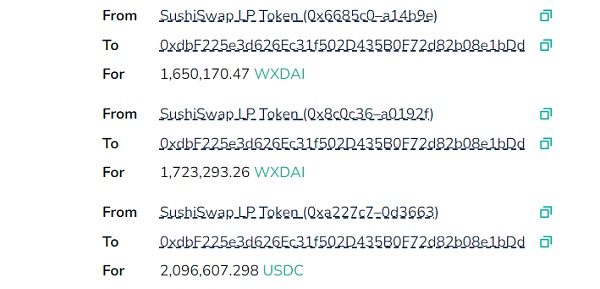 4. 最后攻击者归还从 SushiSwap 借出来的 xDai 和 USDC,剩余的非法获利转到攻击者账户上。