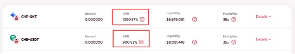 3.二池组LP。其实也是一样的道理,为了给项目提供矿币买卖的渠道,项目方开设超高利率的LP资金池,吸引用户为项目提供交易流动性。比如CHE-USDT这种就是典型的二池LP。