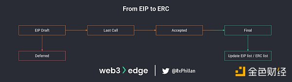 然而,ERC 已经是一个约定俗成的标准,已经包含在开发者同意使用的以太坊文档中。在一个 ERC 成为 ERC 之前,它开始是一个 EIP(Ethereum Improvement Proposal). EIP 本质上是非常详细的论坛帖子,用户可以在其中对以太坊区块链和生态系统的变化进行争论、讨论和投票。