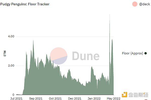 据Dune数据,传统蓝筹NFT项目Pudgy Penguins的地板价在近半年来逆势上涨,现在地板价约4 ETH,是其长期地板价1 ETH的4倍。