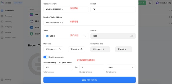 首先是 Zebec Pay,主要用于资金的发送与支付。接着上面的例子,如果 DAO 想要向成员 A 支付网站设计的薪酬,主理人可以如下图使用 Zebec Pay 发起支付。