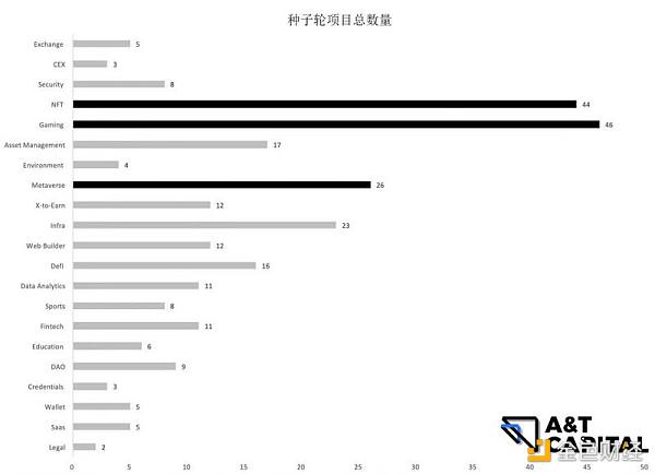 由图可见,种子轮融资项目数量前三类别:游戏、NFT、元宇宙。种子轮融资金额前三类别:交易所、中心化交易所、安全。