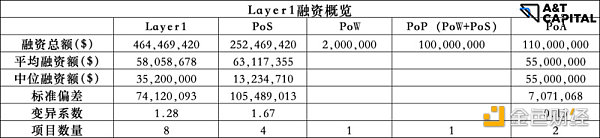 总体数量太少,不具有统计意义。总体来说,Layer 1 & Layer 2属于融资额度高,赛道火热。按照技术流分项目的话,融资额度相差不大。
