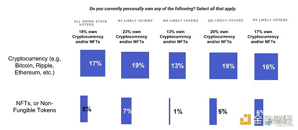 民意调查还发现,近五分之一的选民拥有数字资产。从这个数字来看,现在每个摇摆州拥有数字资产的人数远远多于工会会员。