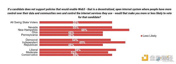 55% 的受访选民不太可能投票给反对启用 Web3 政策的候选人(定义为去中心化、开放的互联网,个人可以更好地控制他们的数据)。