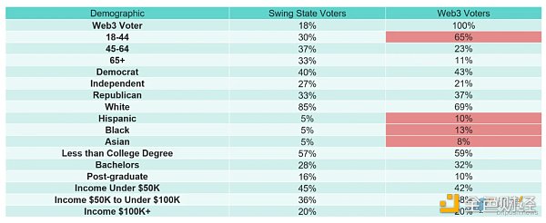 这项民意调查清楚地表明,在这些摇摆州,Web3 选民现在代表了中产阶级选民的重要群体,并且比整体人口更年轻、更多样化。