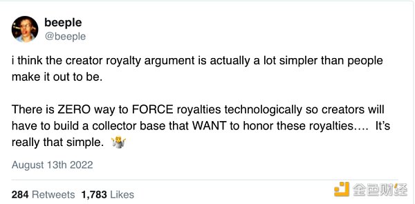我还想说的是,这其中有大量的细微差别。不是所有的创造者都是平等的。我知道一旦我们开始讨论这些事情,它就会变成一个难以置信的滑坡,但在我看来,我们已经在这个滑坡上了,现在忽略它是不成熟的。一个 1/1 的艺术家和一个发布 10k pfp 项目的团队是不一样的,他们有一个路线图,有一个高的铸币价格,这和一个有 VC 支持的项目也是不一样的。这些划分是否会影响市场支付版税的决定是一回事。事实是,它已经影响了市场的决定。