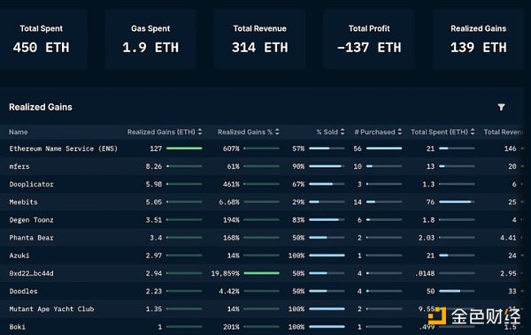 在已实现利润榜排行第六的地址仅通过 ensmaxisnft.eth 获得榜六地位,该域名在 7 月份以 111.69 ETH 成交。