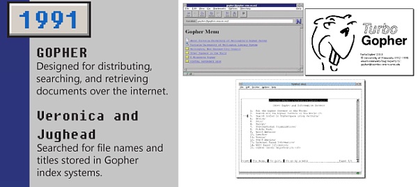 第一个基于内容的搜索协议: 同样在 1991 年,第一个检查文件内容而不仅仅是文件名的搜索协议被推出。像 HTTP 一样,它是一个运行在 TCP/IP(互联网)之上的应用层协议。它被称为 Gopher(地鼠)。