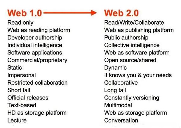 WEB2: Web2 指的是 2004 年前后出现的高度互动和用户驱动的网站。用户可以发表文章和评论,在不同的网站上创建账户,建立个人档案,与其他用户联系等等。