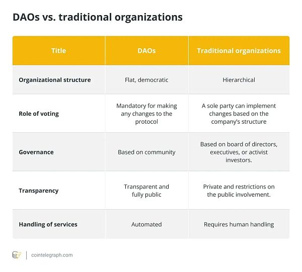 DAO(去中心化自治组织): DAO 是一个互联网原生企业,由其成员集体拥有和管理。他们有内置的财库,决策由提案和投票来管理,以确保组织中的每个人都有发言权。