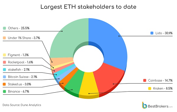 现有的担忧是以太坊将变得更加中心化。让我们看一下来自区块链数据聚合平台 Dune Analytics 的数据。Lido 协议目前拥有最大的 ETH 份额,有 4,152,128 ETH 质押在其中,几乎占信标链总质押池的 31%。这个数量相当于有 129,754 个验证人,因为他们每个人都需要在信标链上质押 32 ETH。