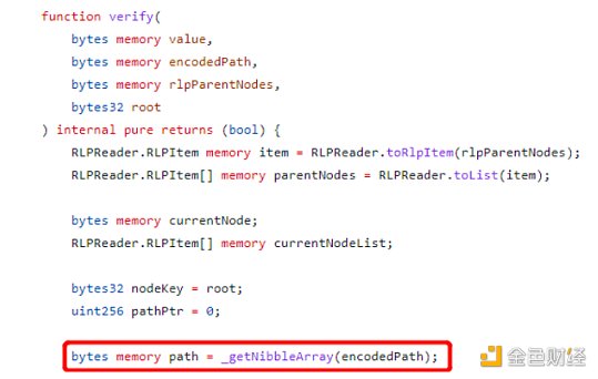 3、跟踪交易验证逻辑中的调用的 MerklePatriciaProof.verify() 函数,发现该函数调用_getNibbleArray() 对 branchMaskBytes 进行了转码操作: