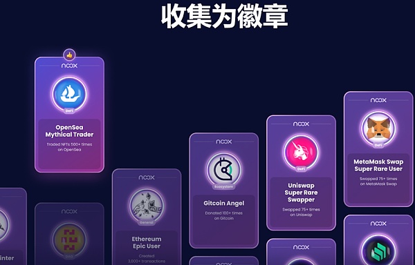 Noox社区可以帮助DApp应用策划情境化的链上活动,希望能建立一个链上行为追踪的开放社区,允许开发者将任务规则编程到铸造的徽章标准中(如交易资金数量、交易频次、交互行为类型、交互时间等),支持用户完成任务后将链上交互行为铸造为徽章NFT。
