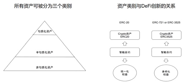 图中清晰表达出,无论是物理世界还是加密世界,所有资产可以分为匀质化、半匀质化和非匀质化三类。匀质化资产包括货币、股票、标准的期权期货衍生品、贵金属等;半匀质化资产包括各类金融票据、碳资产等半标准传统资产、积分卡、会员卡、礼品券等;非匀质化资产包括艺术品、收藏品、游戏道具、大部分实体物品、房产等。