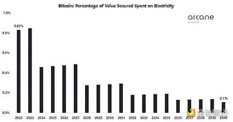 比特币矿工将收入的一定比例花在能源上,这个比例越高,行业的能源消耗就越高。要估计这个百分比在 2040 年会发展到何种地步,我们必须再次审视该行业的竞争性质。
