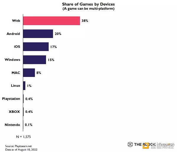 38% 的 GameFi 项目选择 Web 浏览器来托管他们的游戏,其次是手机(37%)和 PC 客户端(24%)。