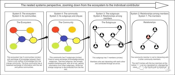 就像身体是由身体部位组成、身体部位又由生物分子组成的细胞组成一样,社区也是如此。身体是更大的社会和生态系统的一部分,社区也是如此。根据嵌套系统模型(Holling 2004),社区存在于嵌套系统的层级结构中:关系中的个体、子群体、社区、社会、生物圈中等。