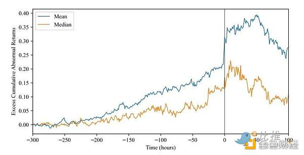 假设所列公告列表中存在内幕交易,那么将发生在加密货币在DEX上币前。DEX无需了解您的客户(KYC)或反(AML)要求,并为个人提供匿名和不受限制的伪交易机会。尽管没有直接的KYC或AML要求,但DEX是完全透明的,所有交易都在区块链上公开可用。我们将该组中的代币标记为可能的内幕交易组(LITG),以便我们可以将其特征(如异常价格上涨)与不太可能(事前)参与内幕交易的代币进行比较;该组包含 98 个列表。我们收集了在上币公告前300小时至公告后 100 小时代币上币的价格变动数据,以监测任何可能成为内幕交易潜在证据的异常交易模式。图1显示了LTIG组的累积异常回报(超过市场回报)的平均值和中位值。目测来看,在上币公告前250小时开始存在明显的上涨趋势,并一直持续到正式上币公告时。由于新信息进入市场且交易员会对此作出反应,公告前还会有大幅上涨。我们观察到的上涨趋势与被起诉的股票市场内幕交易案件的上涨趋势一致(Patel & Putni?nˇs, 2020)。