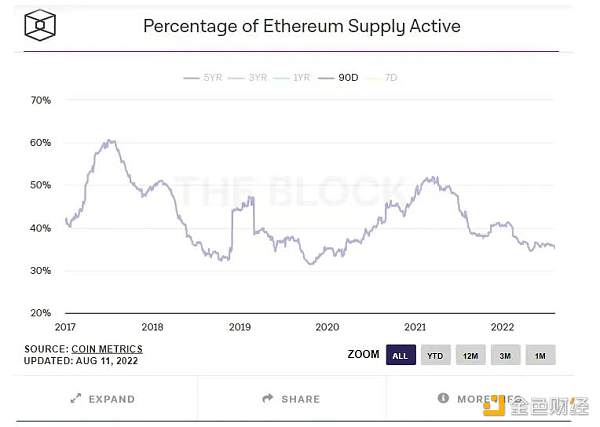 在以太坊的情况下,只有约 1/3 的代币是流动的(在过去 90 天内移动)。这意味着,一旦达到接近 30% 的稳定状态的质押率,无论拥有多少资金,都将很难攻击网络。攻击者需要购买全部流动性供应,这是不切实际的,且几乎是不可能。