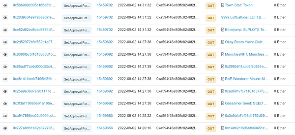 通过分析,子多次调用 SetApprovalForAll 盗取用户资产,子地址目前已收到 33 个 NFT,售出部分后获得超 4 ETH。