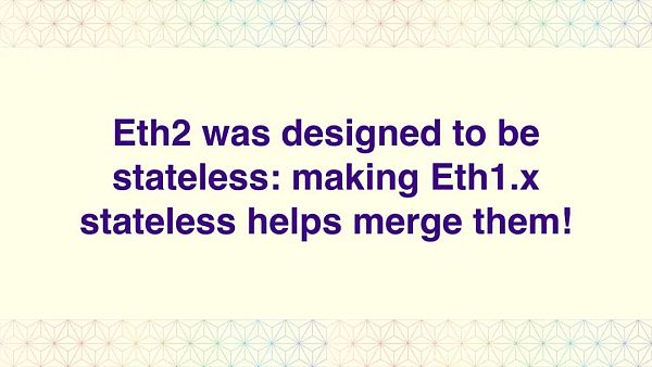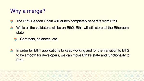 该部分陈述了需要合并 Eth1 和 Eth2 的原因:为使 Eth1 的应用能继续工作,要把 Eth1 的状态和功能都迁移到 Eth2 系统中;然后介绍了合并所涉及的三个步骤:无状态 Eth1、Eth2 的 Phase 0 和 Phase 1;然后是形成合并规范。