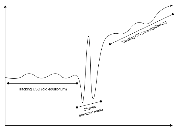 如果美元不再是可行的参考资产,RAI 生态系统内部体验的程式化图表将意外过渡到基于 CPI 的制度。
