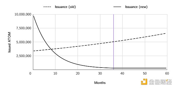 该想法是在最初的几个月加速通货膨胀,以帮助引导Cosmos Hub的资金库,这样链间分配器就可以发挥作用了。实际上,这是以ATOM持有者利益为代价的,因为适用于他们的通货膨胀奖励并没有按比例上升。在前9个月,ATOM的通货膨胀率将比现有水平高出3倍,但随后由于受ICS消费链的流动性质押和通货膨胀奖励的影响,将迅速下降。