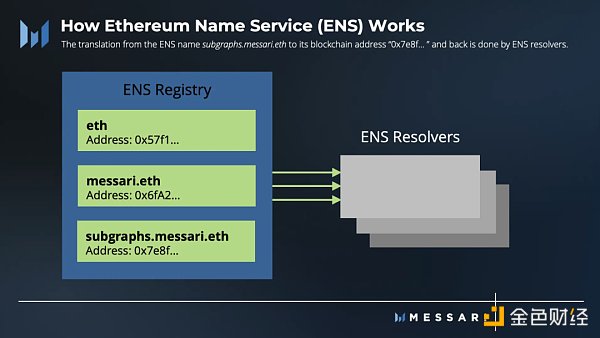 ENS 的核心是在分层名称系统上运行。部署为链上合约的顶级注册表记录每个 ENS 域(例如,messari.eth)和子域(例如,subgraphs.messari.eth)。 ENS 注册表控制域并管理子域的分布。从 ENS 域名(例如,messari.eth)到相应的区块链地址(例如,“0x6fA2……”)的转换是由称为解析器的智能合约完成的。(推荐阅读:《多角度解析ENS:迈向Web3时代的“钥匙”》)