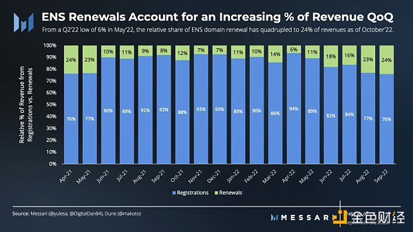 在过去两个季度中,ENS 域名续订已占总收入的很大比例。从 5 月份的 22 年第二季度低点 6% 开始,ENS 域名续订的相对份额已翻了两番,截至 10 月份占收入的 24%。